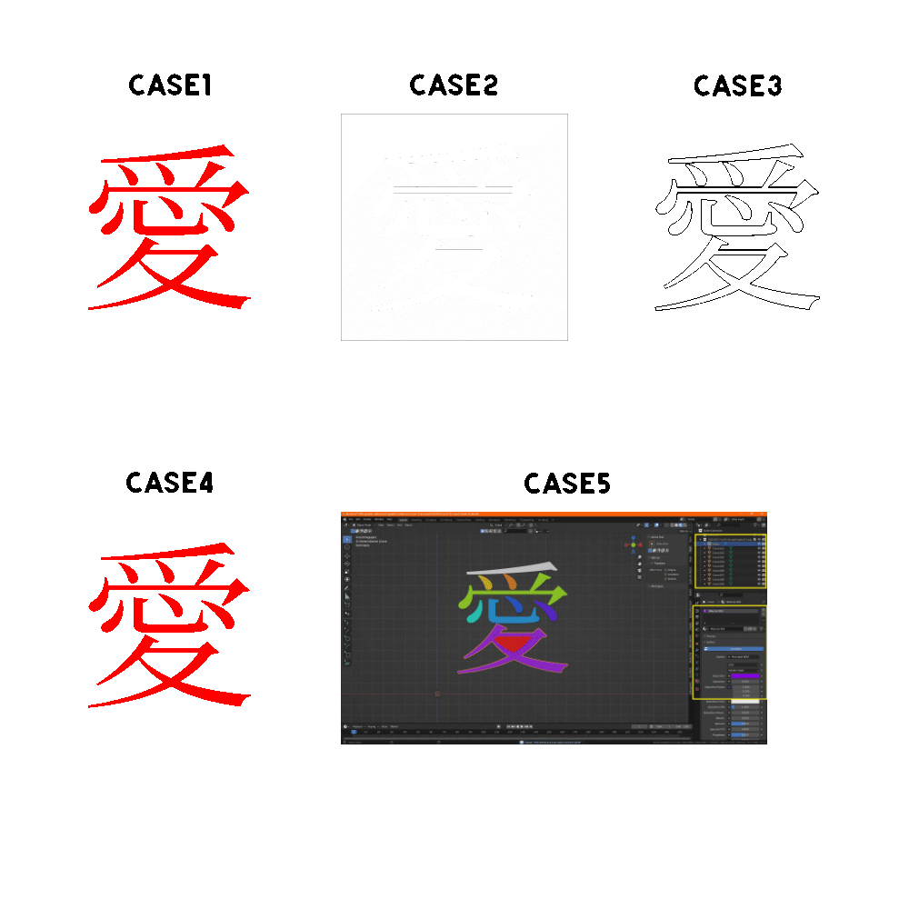 For Case1 – Case4, Default letter, ai, u611b(*), SVG & blend files for creating 2d and 3d designs. ref) I use Affinity Designer and Blender.